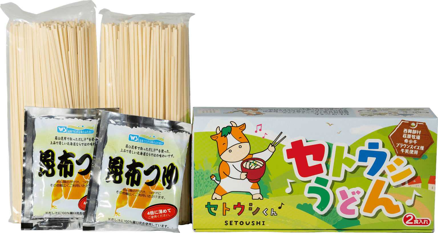村内の牧場の搾りたて生乳(ブラウンスイス種)を道産小麦「きたほなみ」の小麦粉に練りこんだうどん乾麺。当村の公式キャラクター「セトウシくん」がプリントされた愛らしいパッケージで思わず手に取ってしまいます。