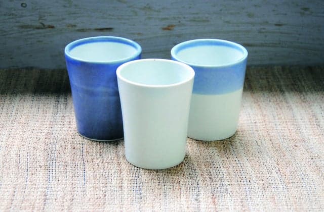 浦富海岸の漁港、田後付近の土を用いた焼き物。やわらかな白地に青の紋様が清々しく、頼りがいのある日用品の雰囲気を漂わせています。いわみ工芸村で陶芸体験もできます。