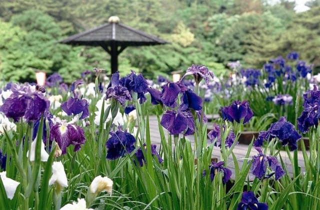 約10,000株の菖蒲が、約2.900平方mの花菖蒲園を埋める。伊勢系、江戸系、肥後系と約100種も揃う。また、秋の紅葉も美しい。