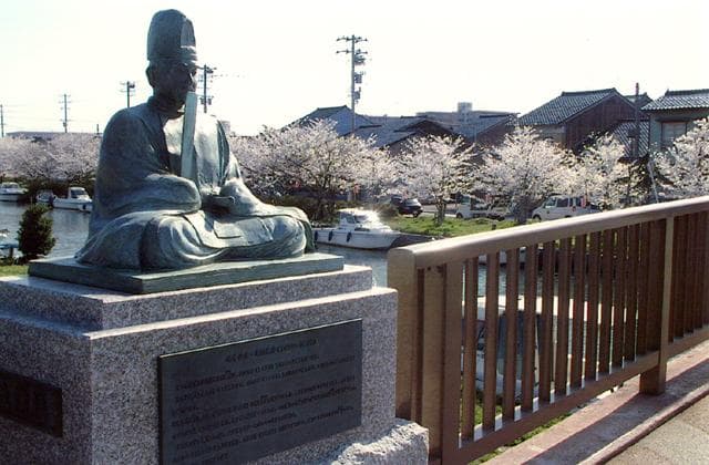 射水市放生津にゆかりのある室町幕府第10代将軍足利義材の像がある橋。