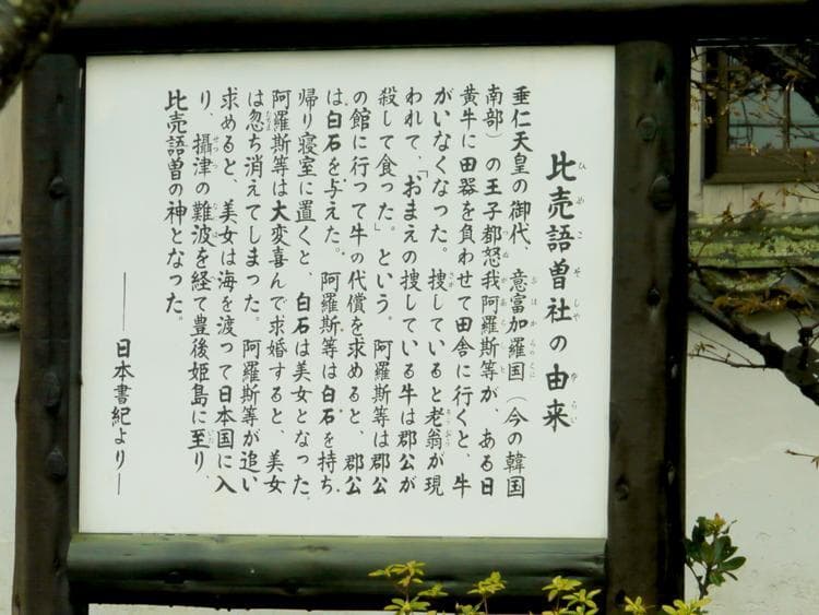日本書紀によると、垂仁(すいにん)天皇の御代、意富加羅国(おほからのくに・今の韓国南部)の王子が、白い石から生まれた姫と結婚しようとしたが、それを逃れ、姫島に辿り着いて比売語曽の神になったと記されています。