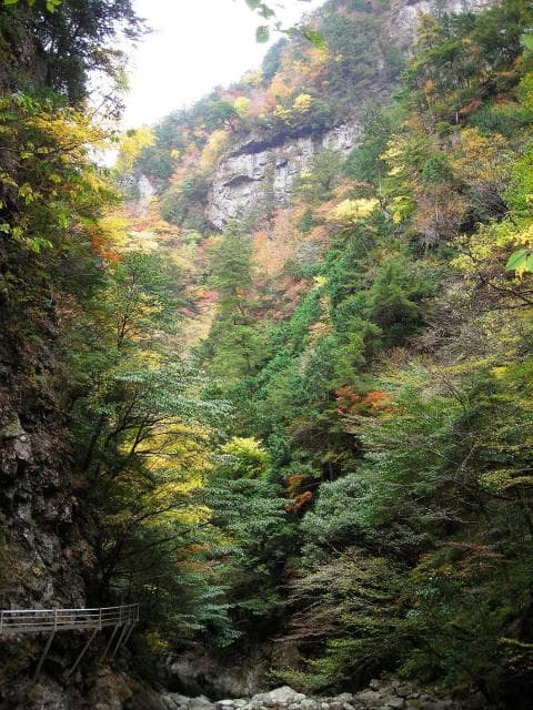 飛瀑・奇岩・絶壁・原生林などがある奥香肌峡を代表する渓谷。落差60mの高滝がメインの川・谷沿いの道で、40ほどの橋、2~30mの岩場に沿った回廊橋も見どころです。