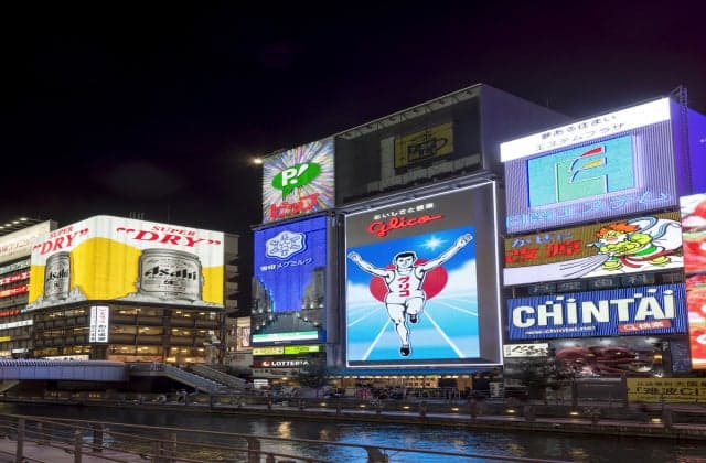水面に映る美しいネオンが印象的な道頓堀水辺の遊歩道。天神祭や歌舞伎の船乗り込みが行われるスポットでもある。