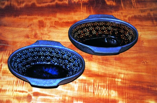 作為的ではなく、あくまで自然な潤いを追求し、深い藍色の大皿など、落ち着いた形と色彩は岩井の風土を彷彿させます。敷地内には、喫茶店や食事処「花」(要予約)もあります。