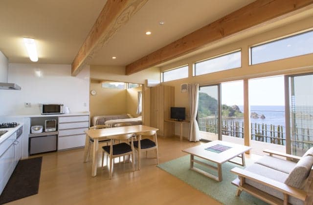 木ノ浦ビレッジには、国定公園特別地域に指定されている美しい木ノ浦海岸に面した長期滞在向けのコテージが8棟あり、お風呂は全室、雄大な日本海を一望できます。珠洲の豊かな里山里海で行う体験や、採れたての海の幸、山の幸をふんだんに使った食事もご用意しております。