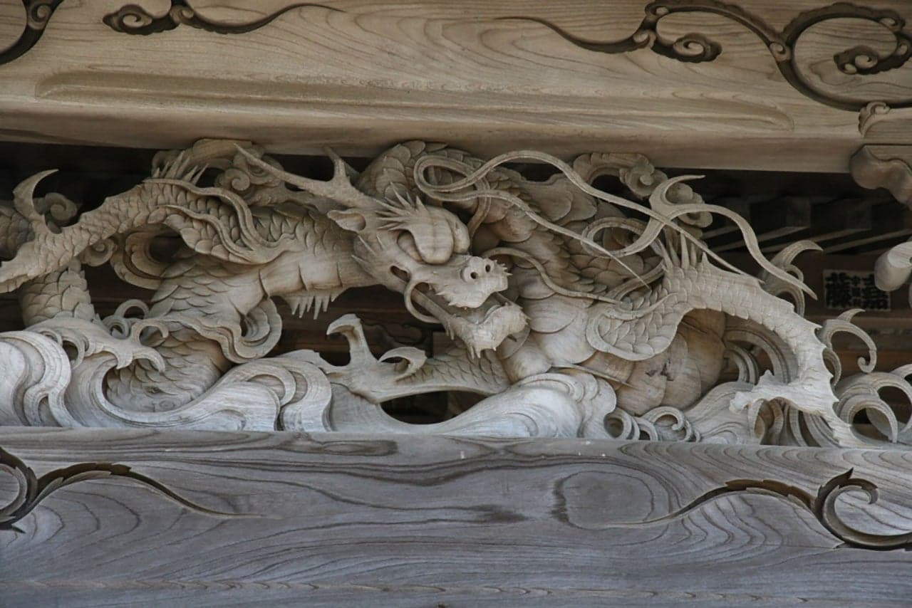 明治4(1871)年の大火で類焼、同10(1877)年に再建され、本殿と拝殿の間に石の間を設けた権現造りで、本殿の壁面には、彫刻が施されています。