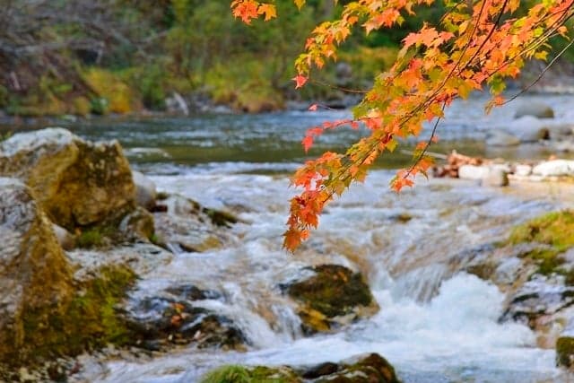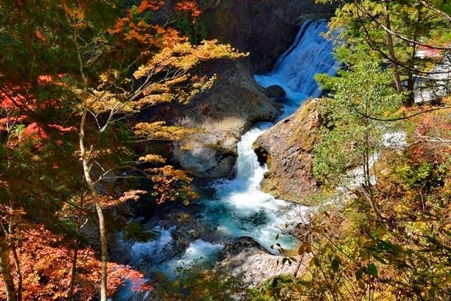 一面が一枚岩に覆われ、三段に落ちる大滝(おおぜん)は、感動の一言。奥志賀渓谷遊歩道添いにあります。