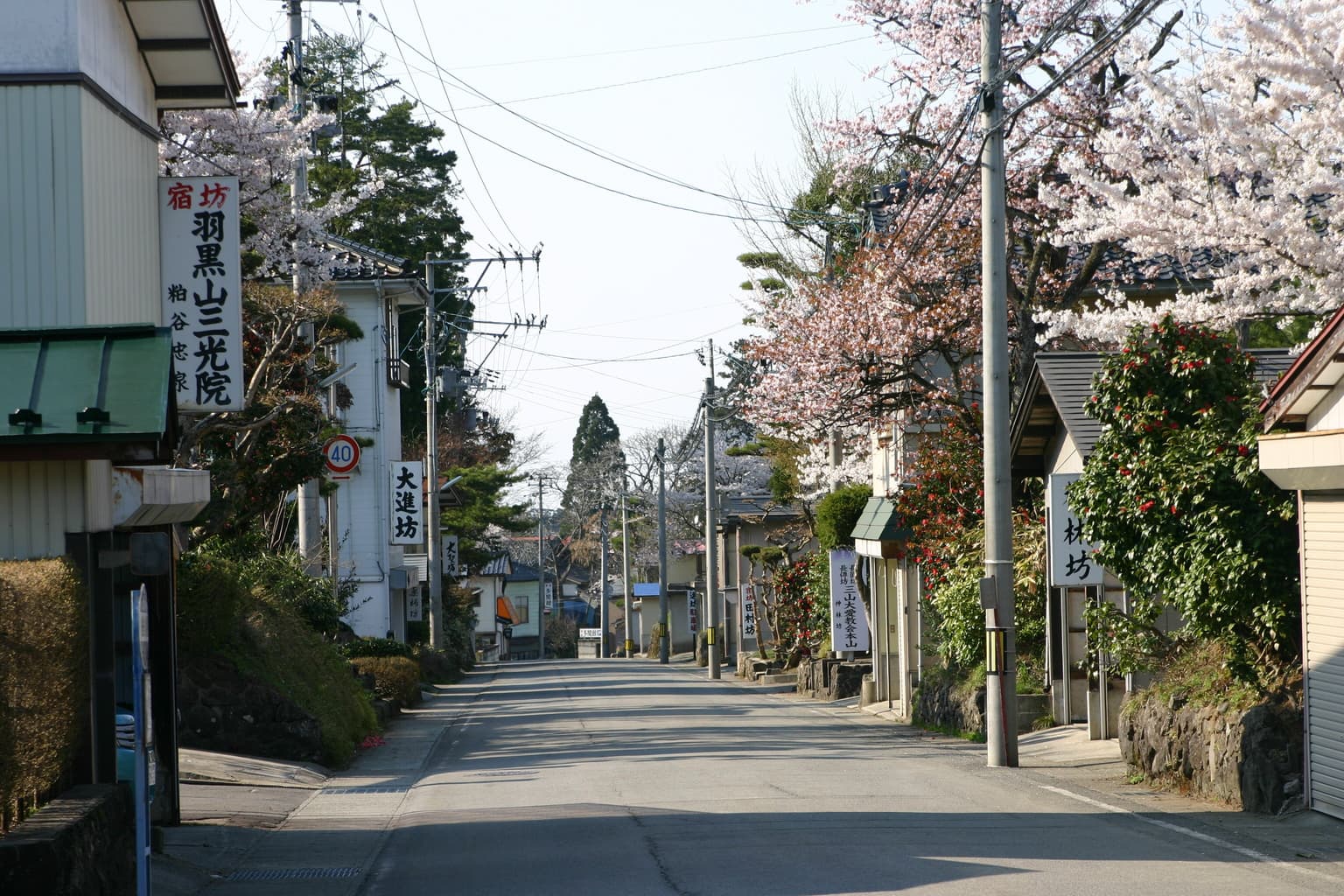 出羽三山の門前町・羽黒町手向地区には、参拝客が寝泊まりする宿坊が立ち並び、幕末には合わせて300余坊を数えたといわれている。現在では30余軒を残すにすぎないが、石垣や冠木門をもつ木立に囲まれた敷地の中に唐破風の立派な玄関をもつ茅葺屋根の宿坊、屋根下に羽黒山松例祭の引き綱をかかげた家々が建ち並ぶ。