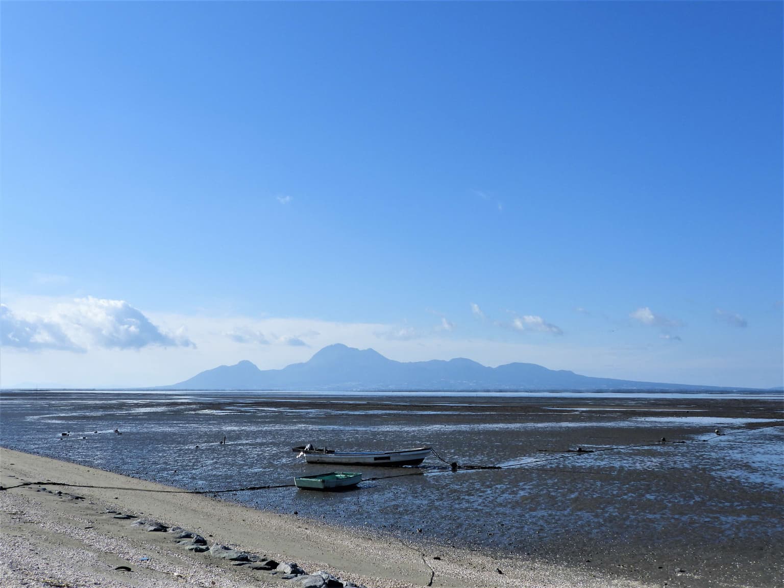 有明海に臨む荒尾干潟の対岸には雲仙がそびえ、遠く海苔の養殖棚も確認できます。