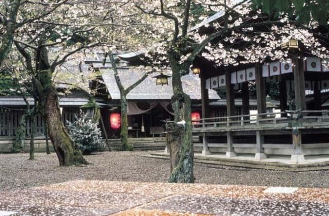 南北朝の戦いで金ヶ崎に籠城し、非業の死をとげた、後醍醐天皇の2人の皇子、尊良親王(たかながしんのう)と恒良親王(つねながしんのう)を祀る神社です。太平記の一話に尊良親王が永年想いを寄せ続けた姫君御くしげ殿とめでたく結ばれた話もあることなどから、恋の宮として恋愛祈願に多くの人達が訪れます。春には「千本桜」が咲き乱れ、絶好の花見どころとしても知られています。