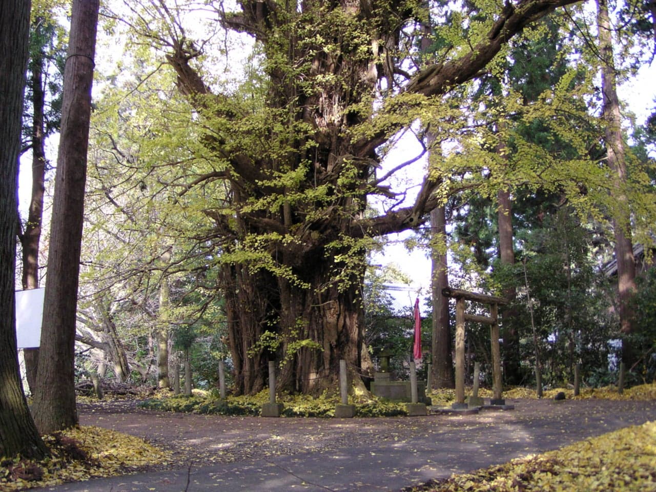 幹の周りから数十本の乳柱が垂れ下がっていることから、「乳銀杏」と呼ばれる県内まれにみる雄イチョウの老大木。高さ40m、幹まわり12m。