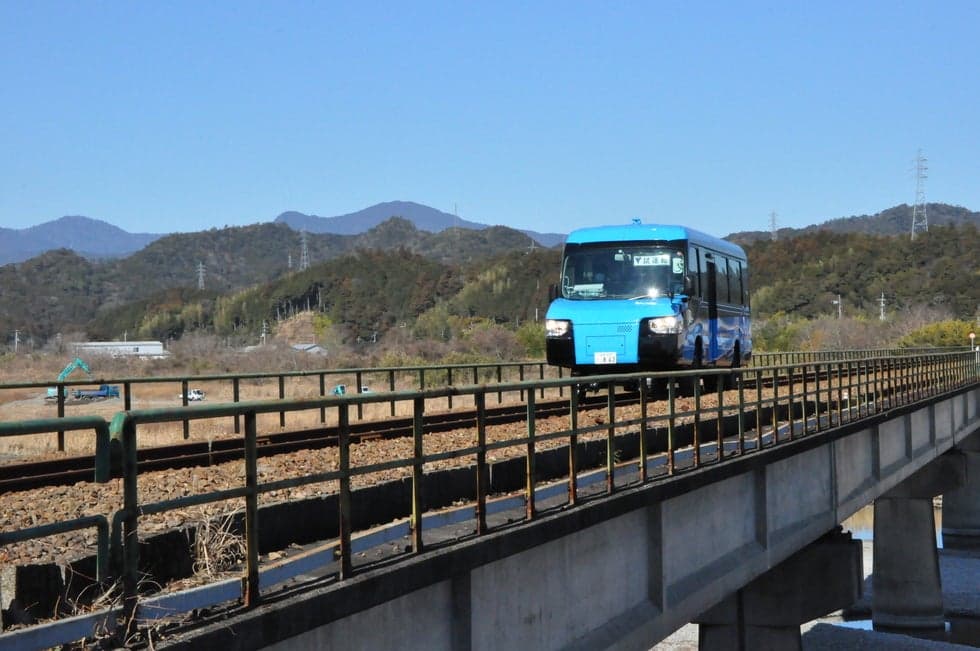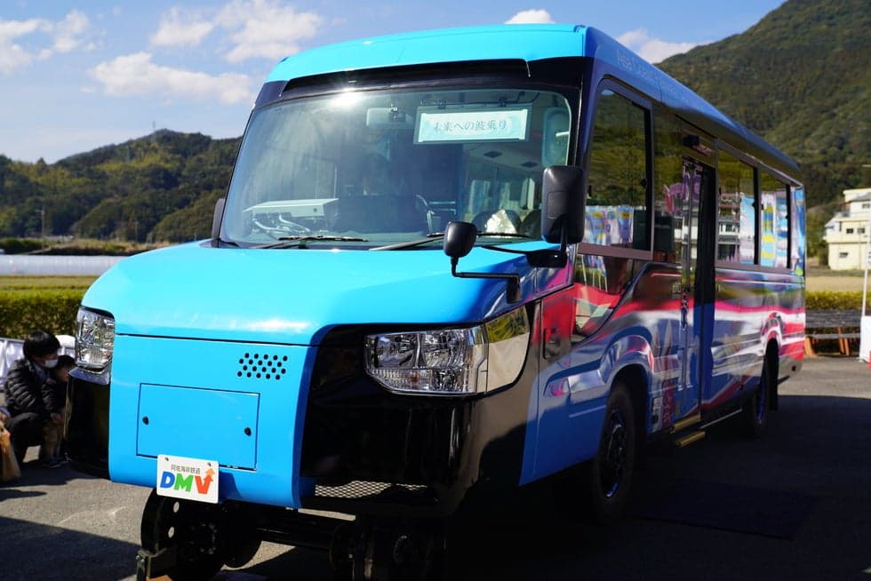 車と列車がひとつになった新しい乗り物、DMV(デュアル・モード・ビークル)。道路と線路の両方を自在に走行できます。2021年12月25日より、世界初の営業運行を開始!