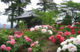 福知山の洞玄寺(別名:ぼたん寺)では4月中旬から下旬には赤やピンク、白など色とりどりの約150株の牡丹が大輪の花を咲かせ参拝客の目を楽しませている。
