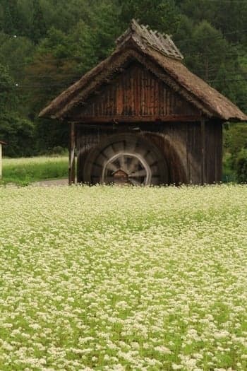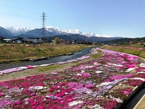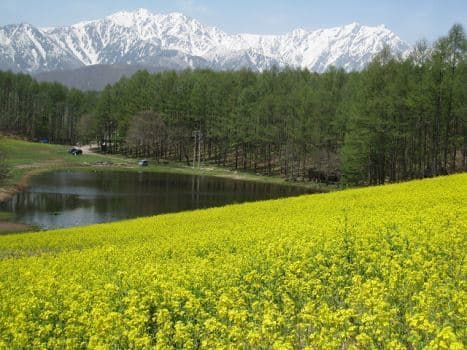 木崎湖温泉を起点に、そばの里「美麻新行」、中山高原をまわり、農具川沿い、R148を走り、木崎湖に戻るコース。コースの途中、長野県天然記念物の居谷里湿原に立ち寄ってミズバショウやリュウキンカ、その他季節の花を観察できます。中山高原は5月は菜の花、8月下旬から9月中旬まではそばの花が一面に咲き、花畑越しに北アルプスを望む絶景が見られます。農具川は川沿いに春はシバザクラ、初夏にはアヤメが咲きます。