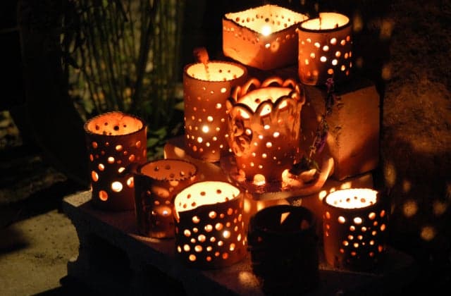 毎年8月中旬頃、「陶の小径」と呼ばれるギャラリーロードから1本入った陶工房や窯元が集まるエリアのストリートで開催されるのが「十六夜(いざよい)まつり」です。当日になると800~1,000本ほどの陶の筒明かりが沿道に並びます。落ち着きのある親密な雰囲気で子どもから大人まで安心して楽しめます。真っ暗な通りにオレンジ色に輝く筒灯りの幻想的な光が、見物客を魅了するほか、各陶房がピザを焼いたり、食事を提供してくれます。中心地では音楽ライブが行われ、また、子供たちも楽しめるキャンドル作りが体験できます。