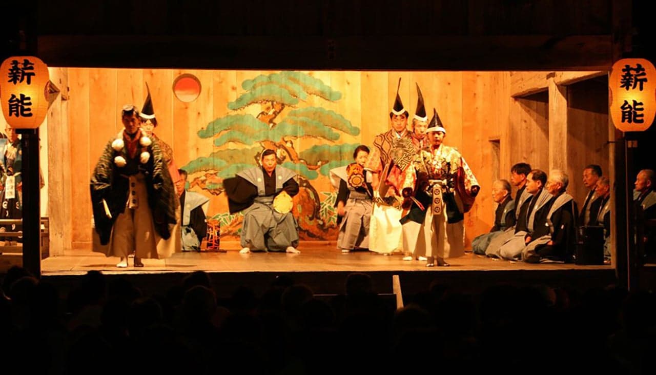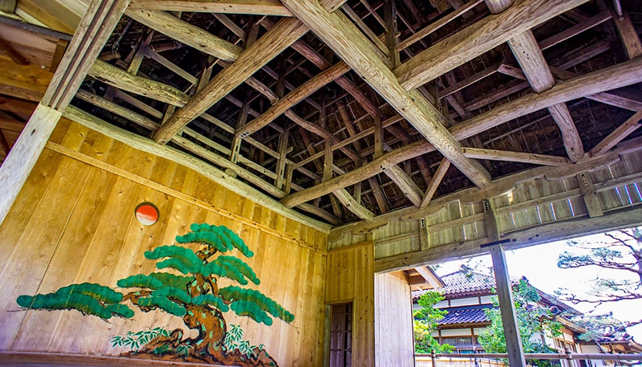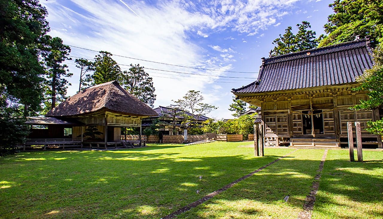 大和飛鳥路に例えられた田園風景に大膳神社が鎮座。地頭・本間山城守によって日野資朝、大膳坊が合祀され、正殿には御食津大神を祀ります。資朝の子・阿新丸が佐渡に渡り、親の刑死の無念を晴らした際、逃亡を助けた大膳坊は処刑。御坊の怨霊を鎮めるために、勧進されたとされます。1846年に再建された茅葺き寄棟造りの能舞台(県の有形民俗文化財)は、定能が盛んであった「国仲四所の御能場」の1つ。佐渡に現存する最古の能舞台と伝わります。現在も4月18日の祭礼には奉納能、6月には能と鷺流狂言が上演されています。