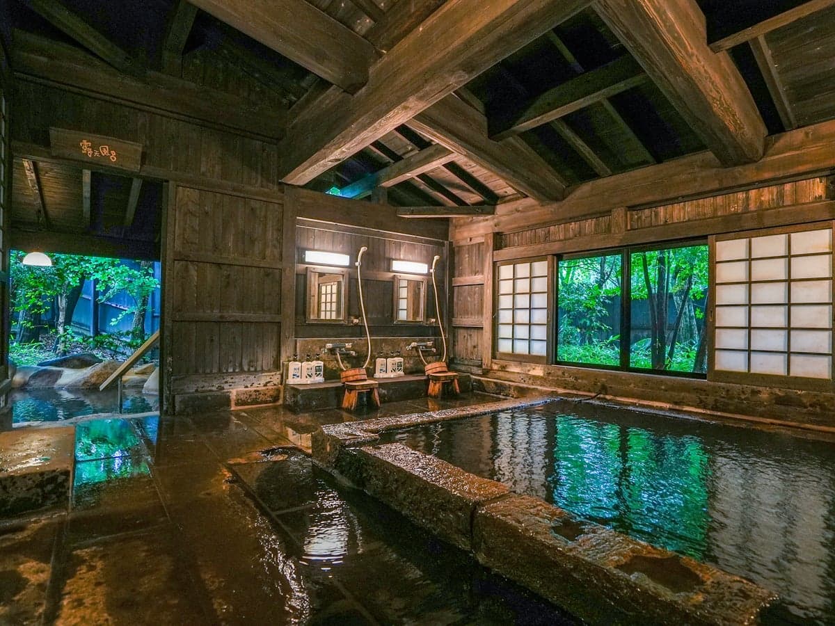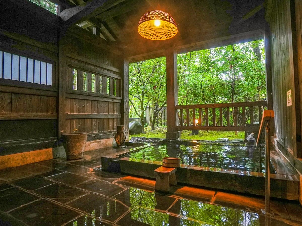 本館エリアから少し足を伸ばした湯小屋には、庭の緑を借景にした男女別の内湯と露天があり、お湯に映り込む木々のシルエットまで美しい佇まい。湯冷めがしにくい塩化ナトリウム物泉のお湯は、なめらかな肌触りも特徴です。この良泉を独り占めしたいなら、貸切湯もどうぞ。