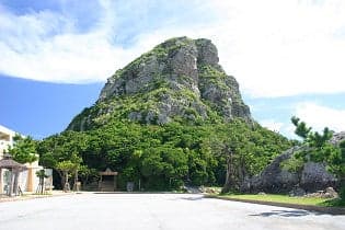 烏帽子のような格好で鎮座し、北は伊是名・伊平屋、南は慶良間まで見える。中腹の展望台より約20分で頂上へ登れる。