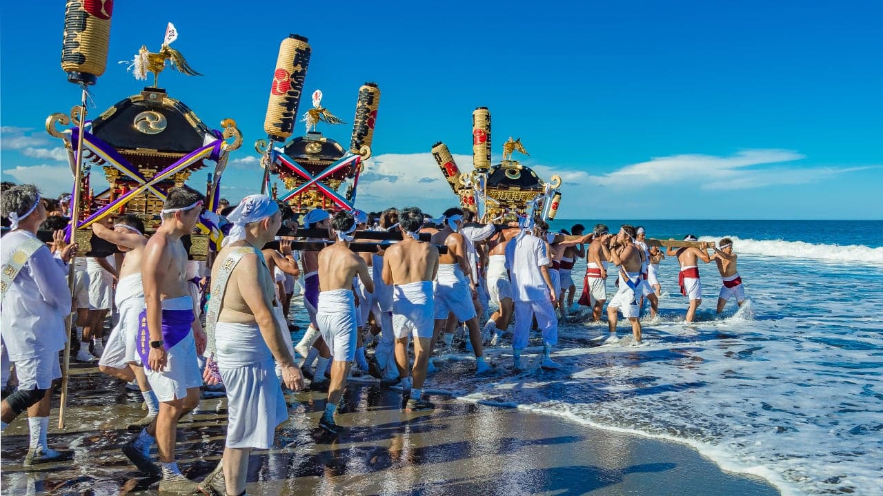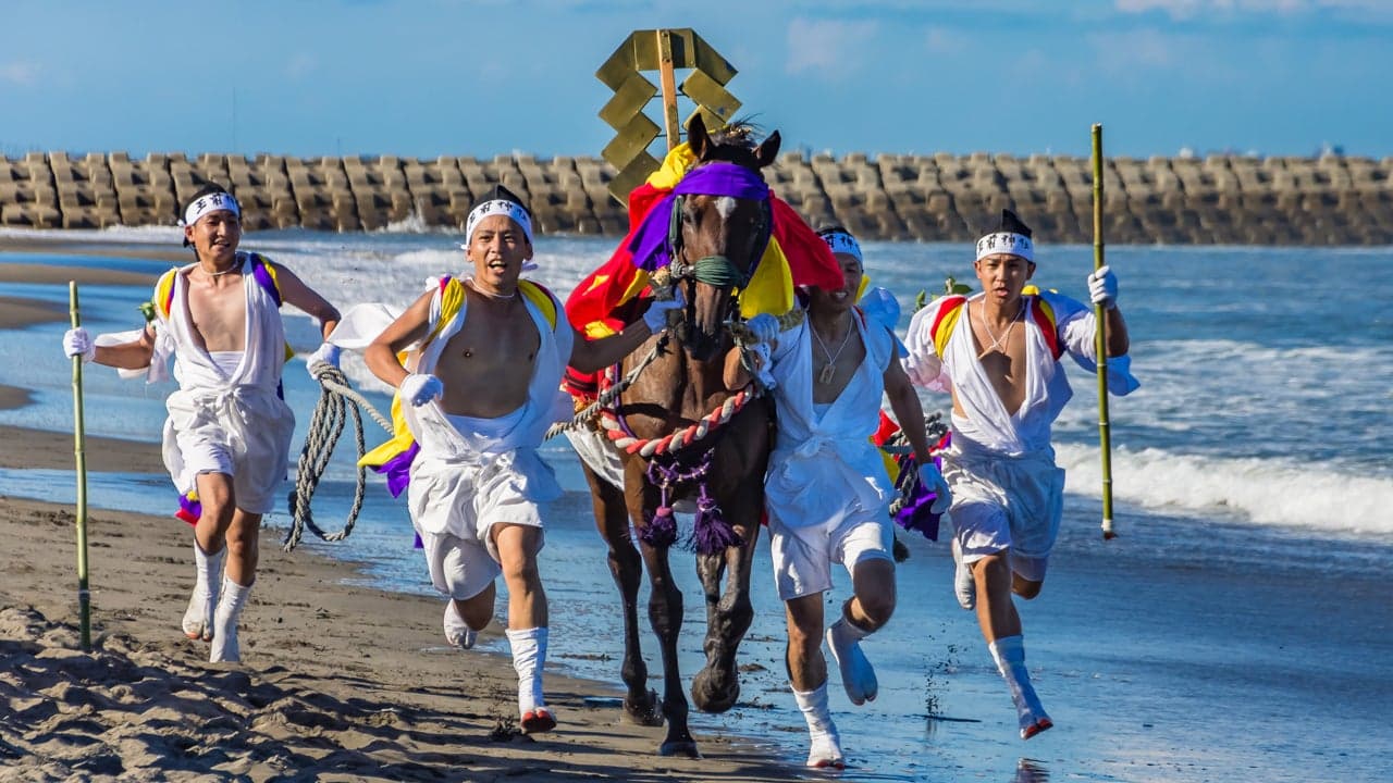 神馬を先頭にゆかりの神々を奉じたお神輿を千名余りの男たちが、それぞれを担ぎ、九十九里浜を疾走し、釣ヶ崎海岸に集まります。その姿は圧巻で、千葉県の無形民俗文化財に指定されています。