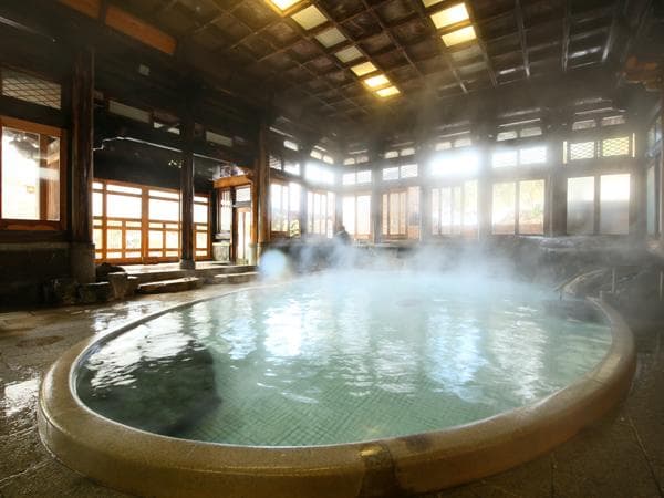 純木造伽藍建築で、平成15年に国の登録有形文化財に指定されました。日本の大浴場ベスト10にも選出された名物風呂です。広々とした湯殿、クラシックな落ち着きと豪華さを漂わせる趣です。温泉蒸し風呂、庭園露天風呂も併設しております。