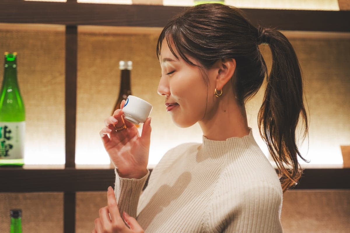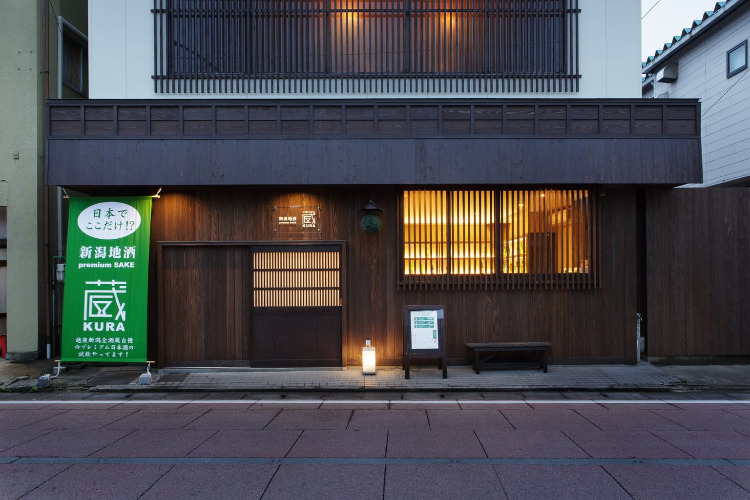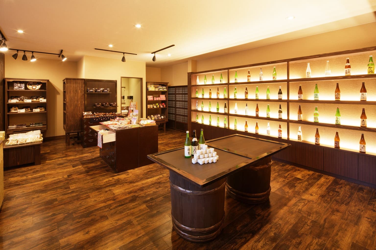 地酒を試飲(立ち飲み)できる専門店舗です。板塀の和風建築に、ぬくもりある和紙提灯、入口には杉玉。のれんをくぐれば、壁にずらりと日本酒が並びます。