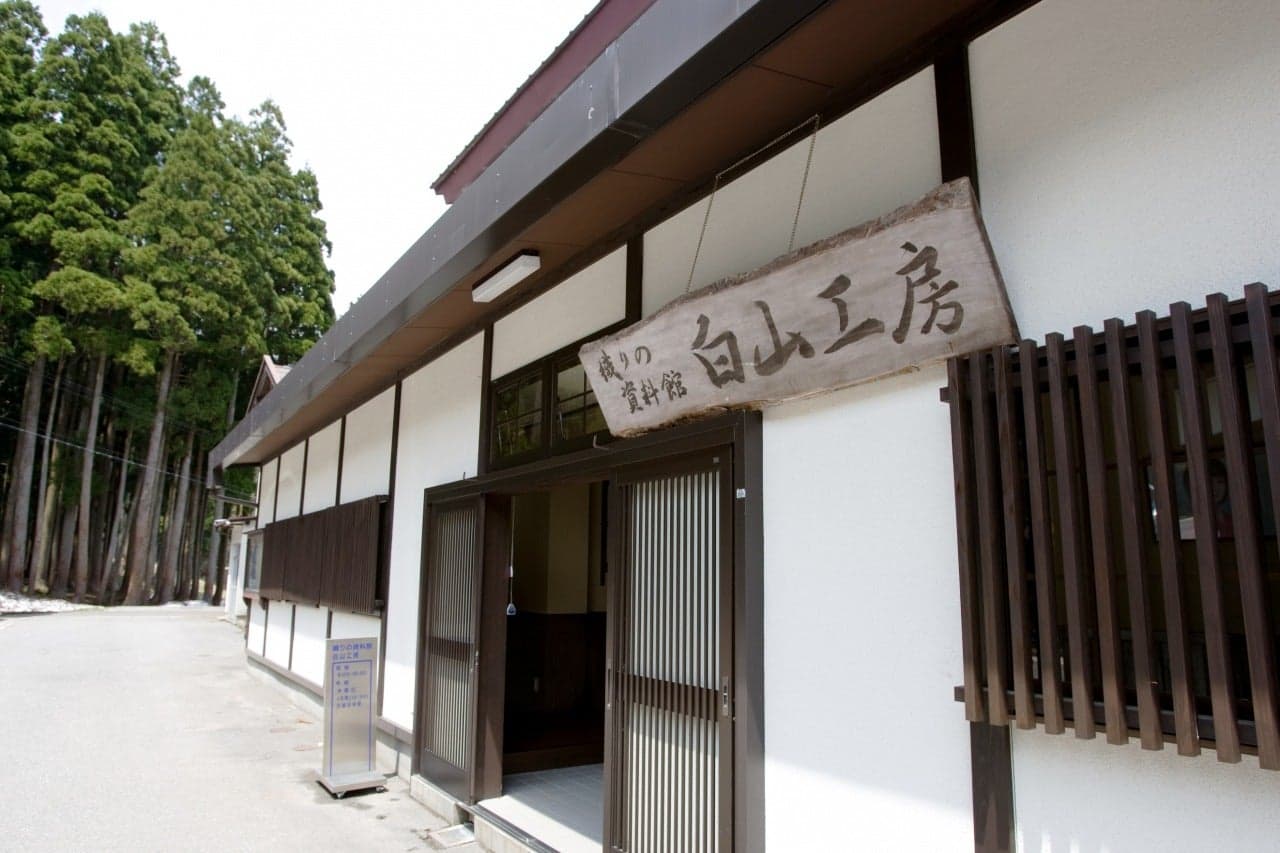 白山工房では牛首紬の工程が見学でき、玉繭から手挽きにより作られた糸が、独自の光沢とぬくもりのある牛首紬になっていく様子をご覧いただけます。織機を使ってコースターを織り上げる機織り体験もできます。