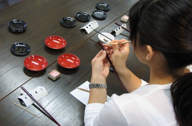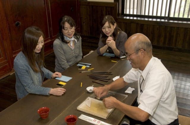 輪島にある静かな職人長屋で、輪島塗にふれたり、職人さんの話を聞いたり、漆に親しむことができます。「My箸づくり体験」では、輪島塗の絵付け技法を体験可能。輪島塗箸に針ノミで模様を彫り、溝に漆を埋めて金粉を沈めます。沈金作業は漆を使用するため、スタッフが代わりに目の前で実施します。沈金体験で作った箸は当日持ち帰ることができますが、蒔絵体験の場合は約2?3週間後の発送となります。お好みのデザインでオリジナル作品を作ってみましょう。