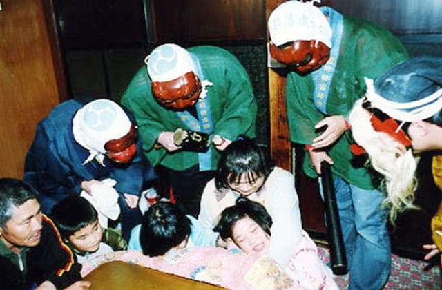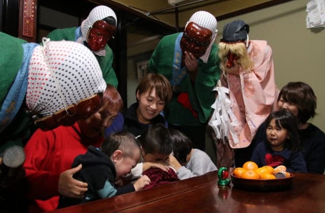 天狗、ガチャ、猿などの面をつけた者たちが金槌やノミやスリコギなどを持って、夜、町中の家々を回ります。「なまけものの子供はおらんか」と言いながら、子供らを脅して怠け癖を戒めます。名前の由来「アマメ」とは、いろりに長く座っているとタコができ、それをはぎ取るという意味から「アマメハギ」と呼ばれる伝承行事です。天狗と異形の面をつけた若い衆が「怠け者はおらんか」などと家に入り、子どもの怠け心を戒めよい子になるようにとの思いが込められています。