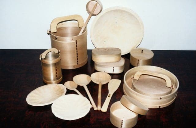 桧枝岐の特産桧(ネズコ)を使い,弁当箱、菓子器花桶等を作る。
