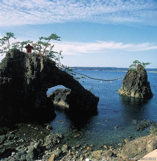その昔能登の地に織物の業を広めた、鹿島郡能登比め神社の祭神、渟名木入比め命(ぬなきいりひめのみこと)が、織機を背負って山越えの折、途中で山賊に遭い、思わず織機を海中に投げたところ忽然としてそれが岩に変じたという。別名能登二見とも呼ばれ、美しい二つの岩がしめ縄で結ばれた神聖な佇まいは一見の価値あり。