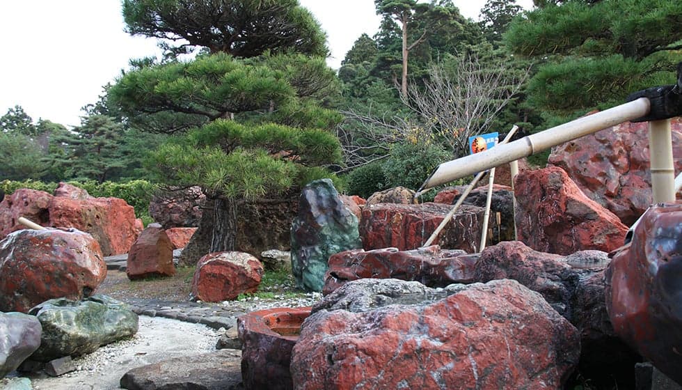 「真野御陵」に隣接。無名異焼、各種銘菓、地酒など佐渡の名産品を幅広く取り扱っています。また、佐渡で産出される「赤玉石」は、皇居や伊勢神宮にも設置されている銘石。その美しい輝きを配した赤玉石庭園で、展示・販売をしています。食事は団体のみですが、大佐渡山脈、真野湾を眺望する喫茶があります。