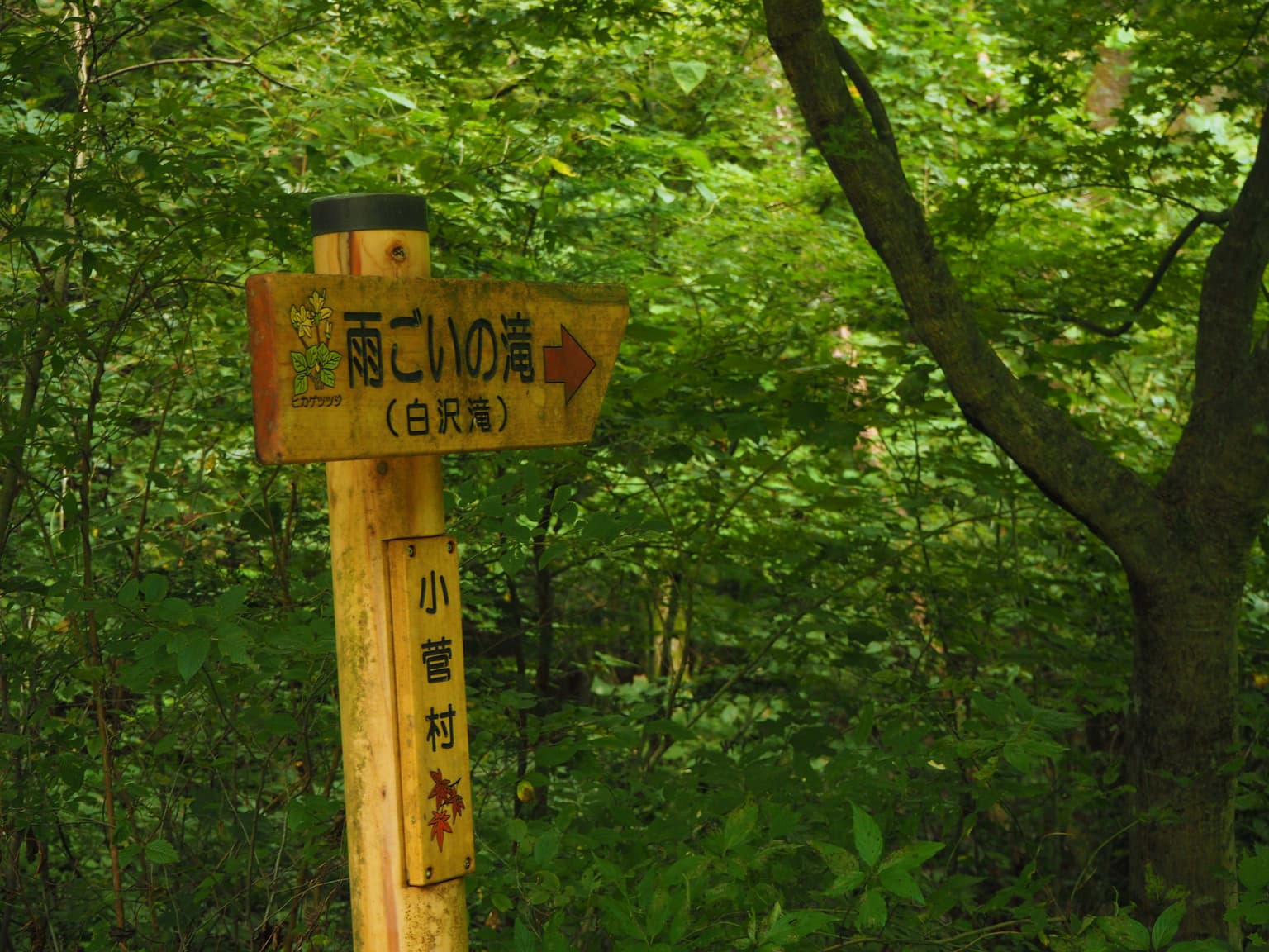 滝の看板は小さいので、木工房を目印にして探してください。木工房からは川に向かって2分ほど歩くと、すぐにたどり着くことができます。