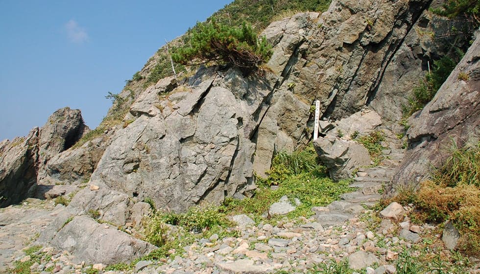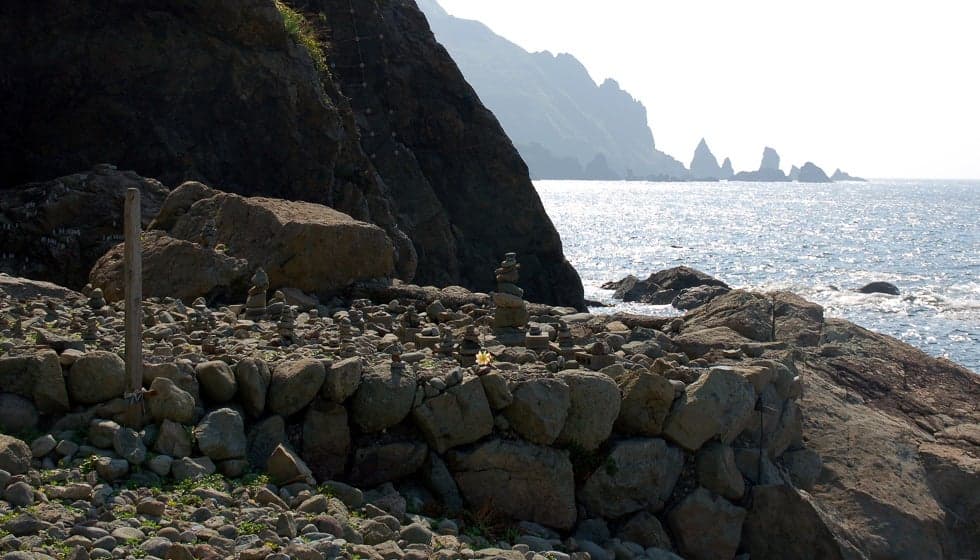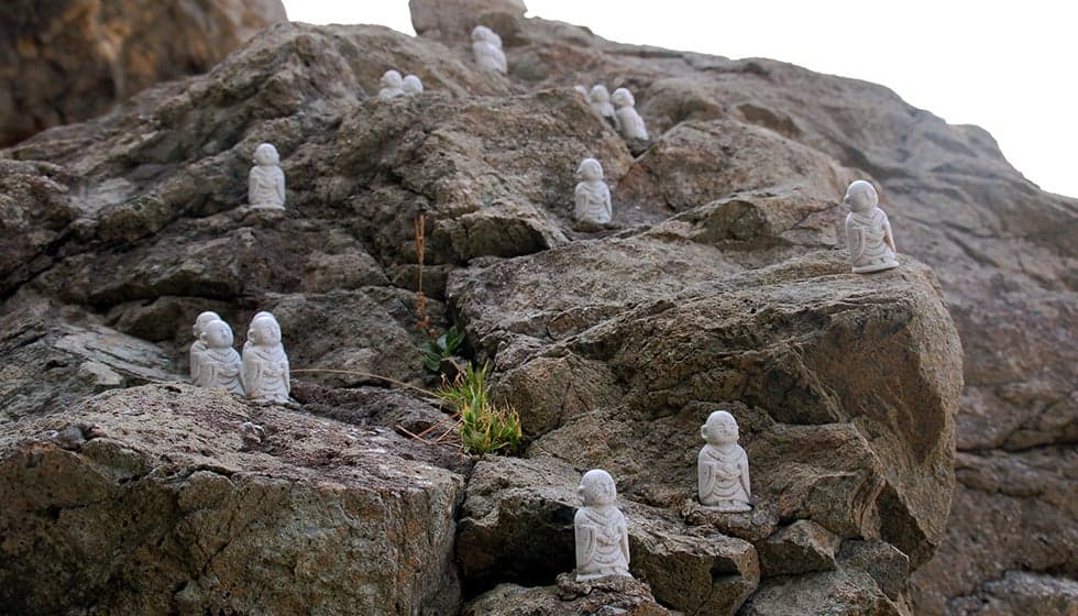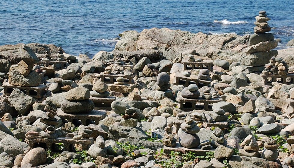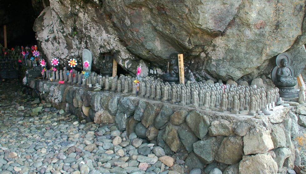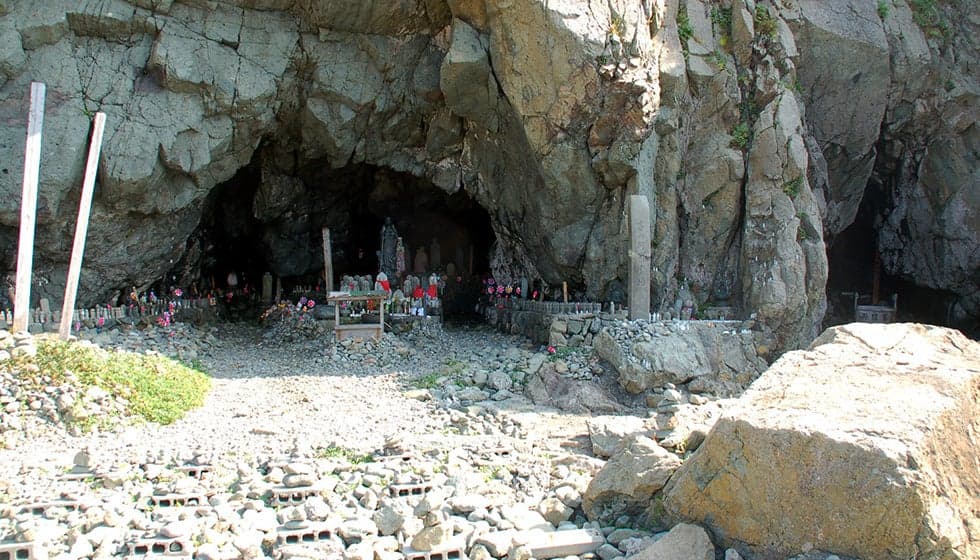 奇岩「大野亀」と「二ツ亀」をつなぐ海沿いの遊歩道。「願」(ねがい)集落から10分ほど歩くと賽の河原に出ます。海食洞穴には、「地蔵菩薩」を中心に無数の石地蔵が静かに並んでいます。冥途との境と言われる賽の河原は、幼くしてなくなった子供の霊が集まる場所と言われ、昔から篤く信仰されています。