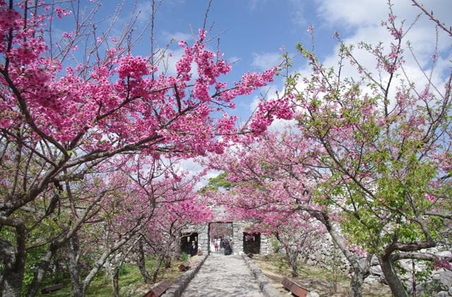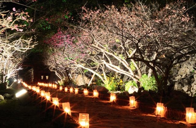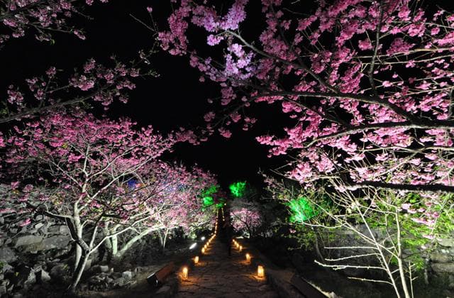 首里城に次ぐ規模(総面積1万7千坪)の面積を誇る今帰仁城跡は、沖縄県北部の今帰仁村に位置します。城跡からは断崖絶壁、緑の深い山々、そして東シナ海が眺望でき、寒緋桜の名所としても毎年多くの観光客や地元客が訪れる名所です。まつり期間中、美しい夜桜と城壁の幻想的なライトアップがお楽しみいただけます。