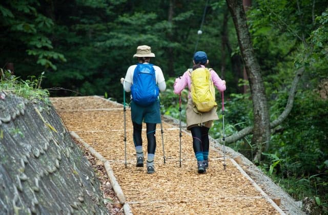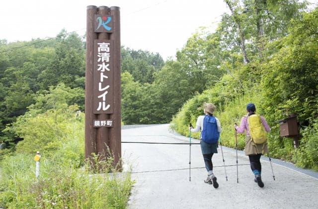 岡山県鏡野町と鳥取県三朝町の県境を尾根に沿って歩くコース。標高735mの人形峠を発着点に、標高950mの高清水高原や1,044mの伯州山などを歩くことができます。コースの一部に敷き詰められたふかふかの木のチップは足腰にも優しく、中国山地の美しい山並みを楽しく気軽に歩くことで、ヘルス&ビューティーな時間を過ごせます。