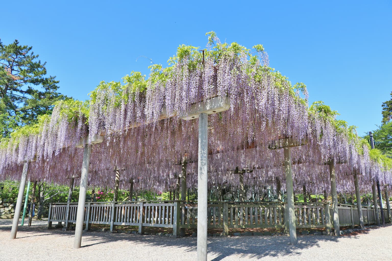 樹齢300年以上といわれ、1本で約350平方メートルの藤棚を一杯におおっています。見頃を迎えると房は60センチを超え美しく咲き誇ります。