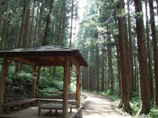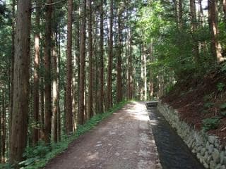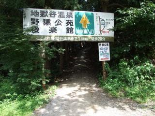 上林温泉と地獄谷温泉を結ぶ1.6kmの遊歩道。入口付近にほんの少しの登り坂がありますが、あとは横湯川左岸の山腹に備え付けられたなだらかな道が続きます。涼しい杉並木の中を歩けば、川音が心地よく、沿道には時折地獄谷の猿も姿を見せます。遊歩道のはるか下を流れていた横湯川が近づけば地獄谷温泉です。