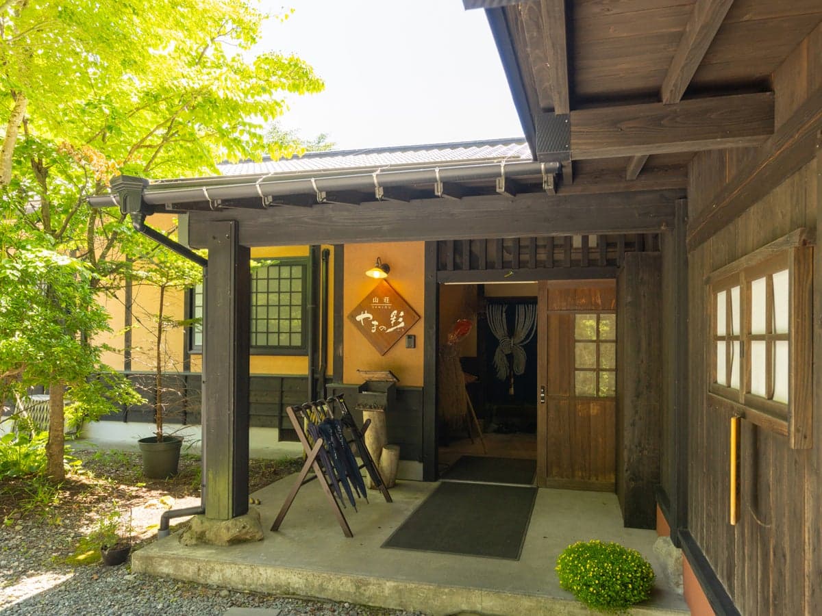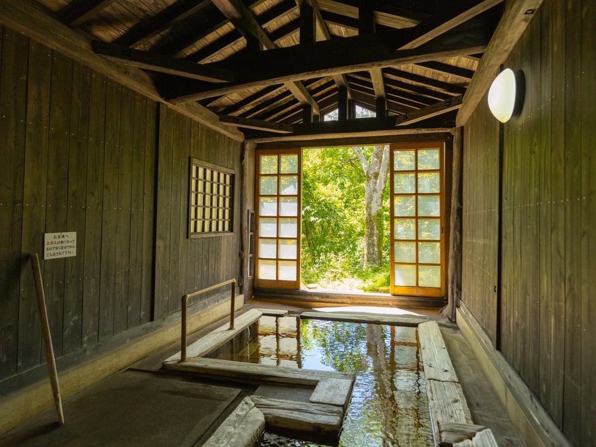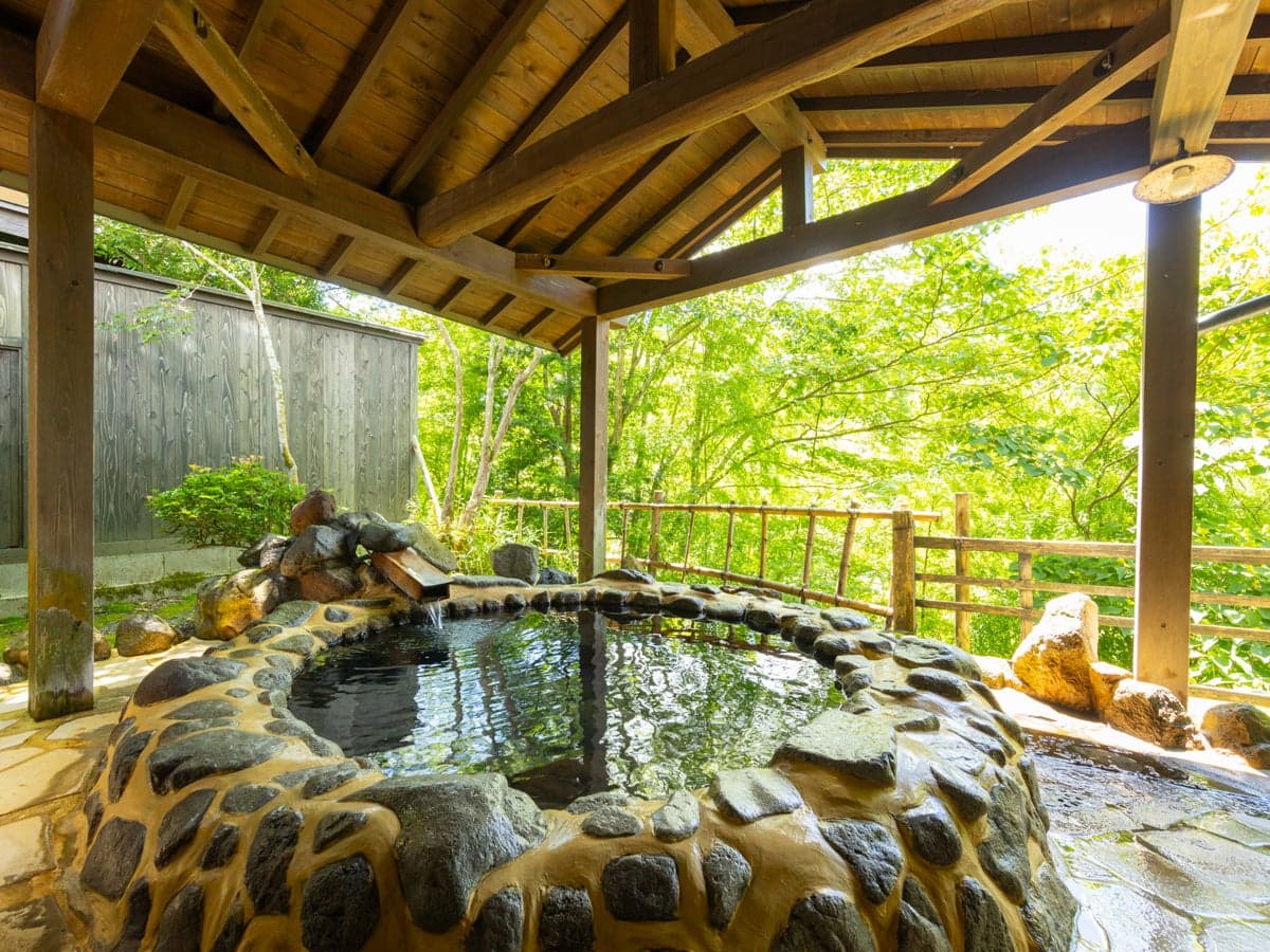 宿泊でも、日帰りでも堪能できる温泉は、すべて貸切のスタイル。大浴場くらい大きな「やまそわの湯」にも、誰にも邪魔されずゆっくりと浸かれるのが贅沢そのものです。水鏡になった湯面に緑が映り込み、その中に分け入るように体を沈めると、心がすっと軽くなるよう。湯口から流れ落ちる温泉がゆらゆらと波紋をつくり、木々の葉を揺らす涼やかな風が心地よく肌にあたります。