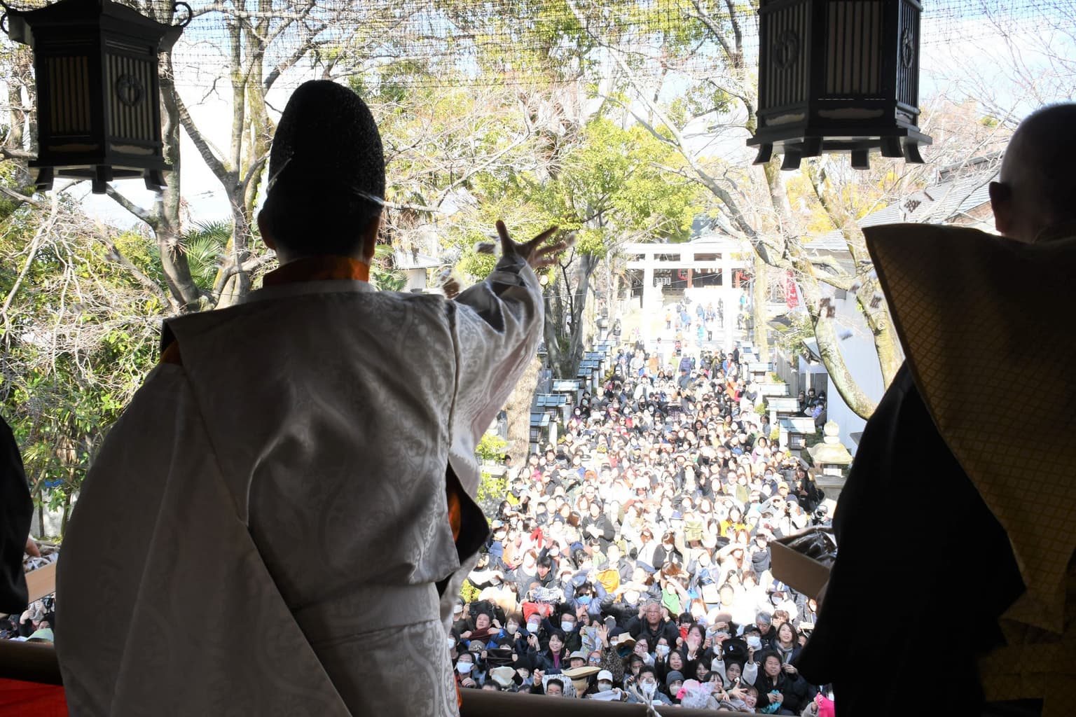 石切劔箭神社の絵馬殿(楼門)二階より、福豆とお餅が盛大に撒かれ、境内は福をもとめる参拝の人々で大変な賑わいを見せます。