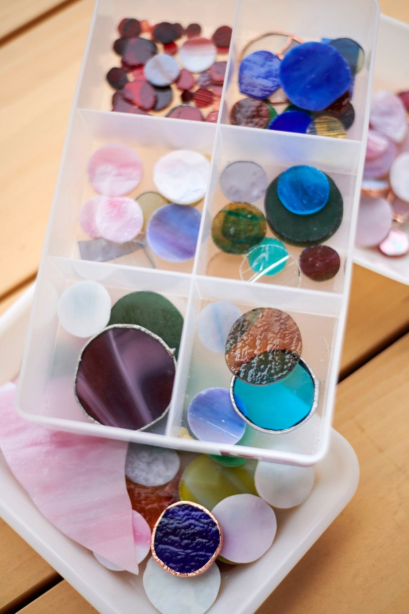 体験では、自分で選んだ色ガラスを好きな形に切ることもでき、あらかじめ様々な形にカットされたガラスパーツから選んで組み合わせることもできます。