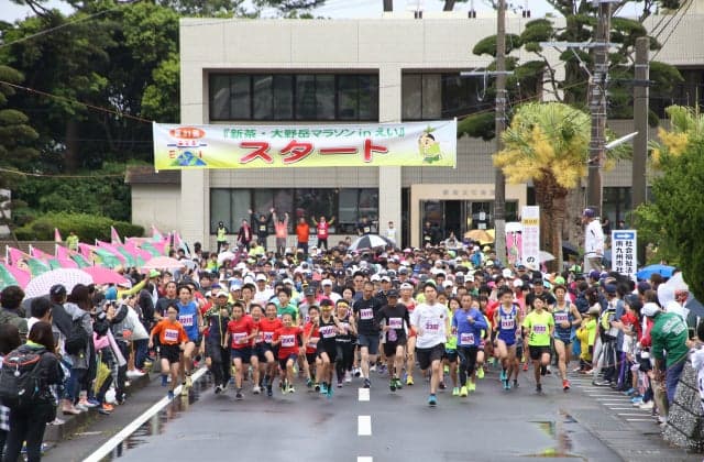 新茶・大野岳マラソンは、頴娃運動公園をスタートし、緑広がる茶畑やすばらしい景観を楽しみながら大野岳の山頂までを往復する雄大なコースを走るフル登山コース(18キロ)のほか、さわやかコース(5キロ)、らくらくコース(3キロ)で陽春の南薩路の風情を楽しむことができます。参加賞(Tシャツ,新茶ほか)、完走者全員に完走記録証を当日発行のほか、南九州市内の温泉入浴券ももらうことができますので、みんなと楽しく走ってみましょう。